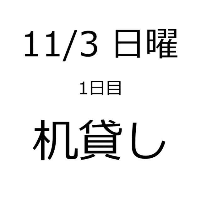 11/3 月祝 2日目 机貸し 長机半分+椅子 2脚 ※出展者パス 2枚 団体名を入力の上、部屋を選択してください。